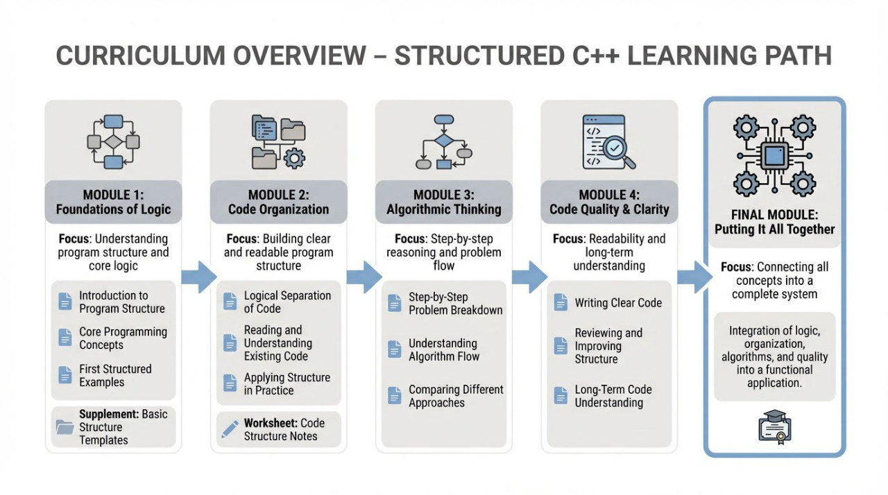 This page describes the step-by-step structure of Compyxli's educational materials. The courses are structured as a sequential system of text modules, where each stage logically builds on the previous one and helps you gradually understand C++ programming.